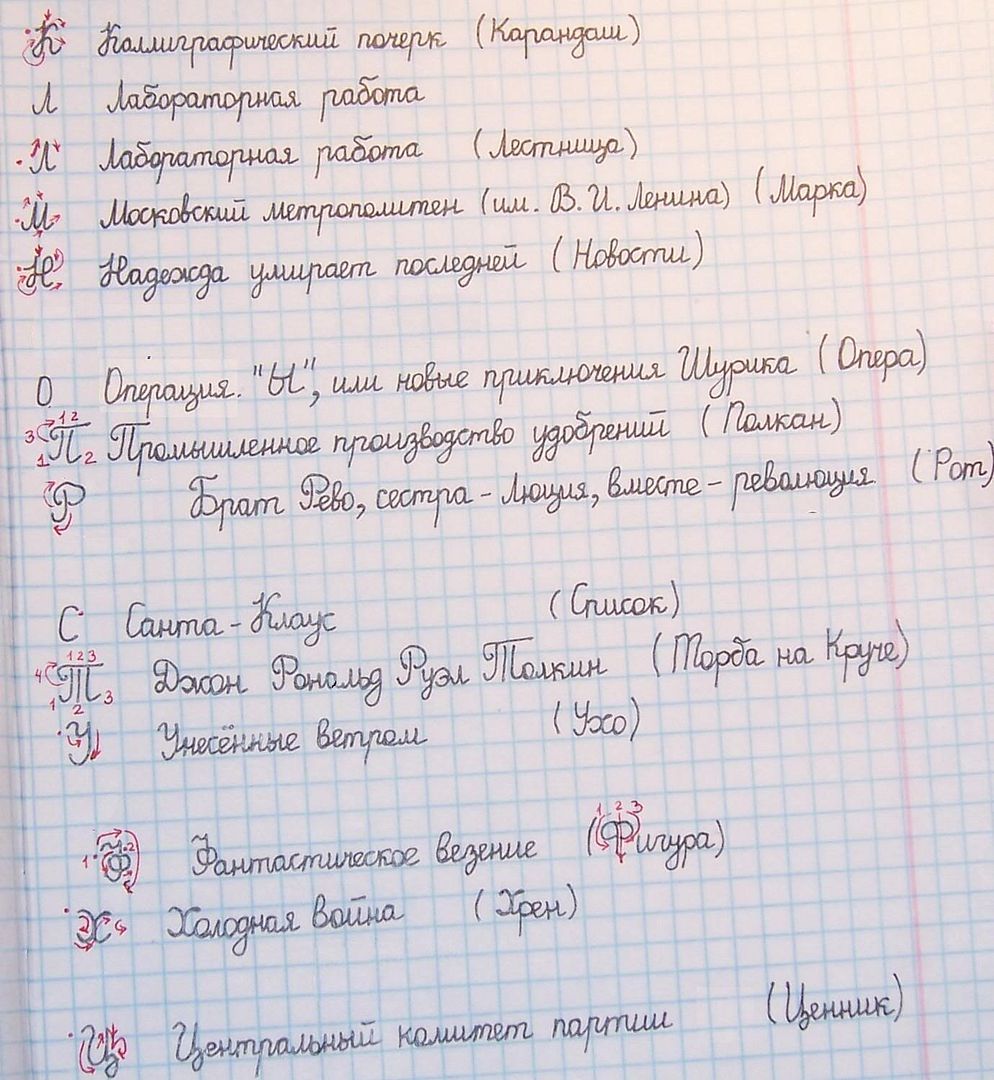 | Каллиграфический почерк (Карандаш) Лабораторная работа (Лестница) Московский метрополитен (им. В.И. Ленина)1 (Марка) Надежда умирает последней (Новости) Операция "Ы", или новые приключения Шурика2 (Опера) Промышленное производство удобрений (Полкан3) Брат Рево, сестра - Люция, вместе - революция4 (Рот) Санта-Клаус (Список) Джон Рональд Руэл Толкин (Торба на Круче5) Унесённые ветром (Ухо) Фантастическое везение (Фигура) Холодная война (Хрен) Центральный комитет партии (Ценник) | Calligraphic handwriting (Pencil) Laboratory practice (Ladder) V.I. Lenin Moscow underground (Stamp) The hope dies last (News) Operation "Ы" or the new adventures of Shurik (Opera) Industrial production of fertilizers (Polkan) Brother is Revo, sister is Luzia, together they form Revoluzia, Revolution (Mouth) Santa Klaus (List) John Ronald Ruel Tolkien (Bag End) Gone with the wind (Ear) Fantastic luck (Figure) Cold war (Horse radish) Central commettee of The party (Price label) |