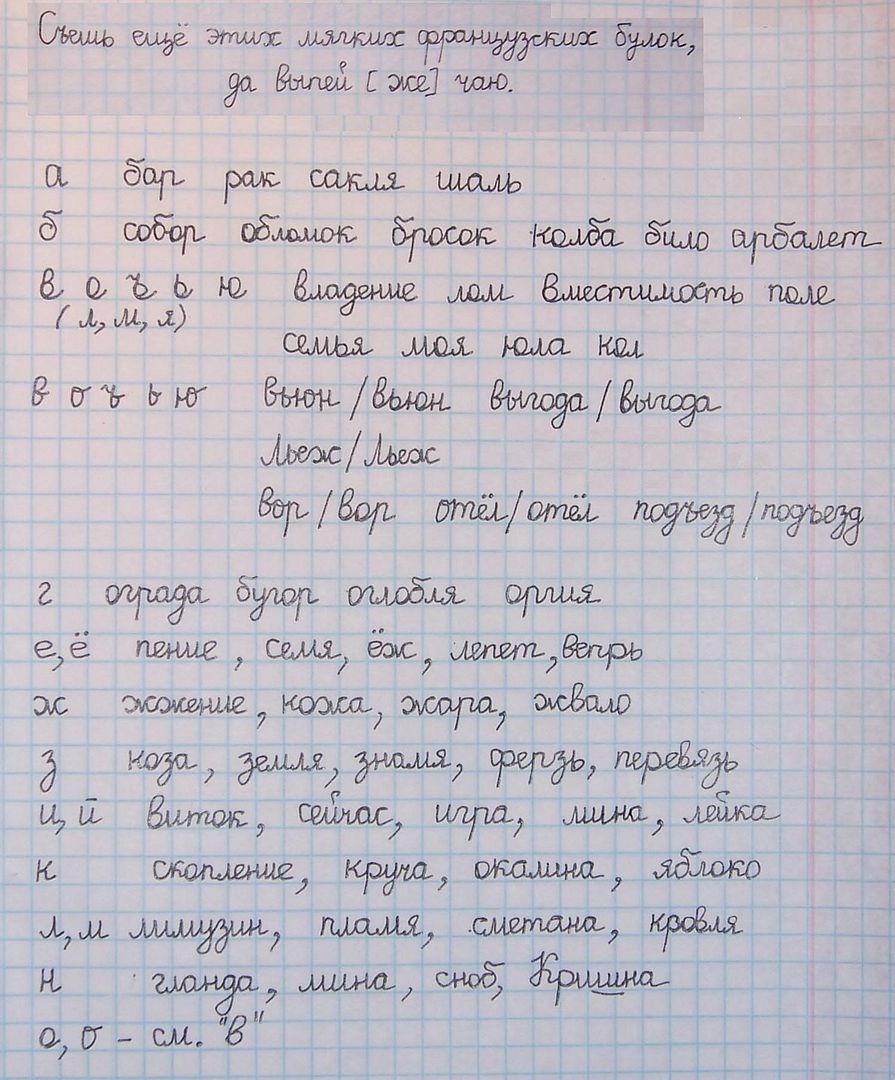 | Съешь ещё этих мягких французских булок, да выпей [же] чаю. а - бар, рак, сакля1, шаль б - собор, обломок, бросок, колба, било2, арбалет в, о, ъ, ь, ю (л, м, я) - владение, лом, вместимость, поле, семья, моя, юла3, кол в, о, ъ, ь, ю4 - вьюн, выгода, Льеж, вор, отёл, подъезд г - ограда, бугор, оглобля5, оргия е, ё - пение, семя, ёж, лепет, вепрь ж - жжение, кожа, жара, жвало з - коза, земля, знамя, ферзь, перевязь и, й - виток, сейчас, игра, мина, лейка к - скопление, круча, окалина, яблоко л, м6 - лимузин, пламя, сметана, кровля н - гланда, мина, сноб, Кришна о7 - см. "в" | Eat some more of these fresh bar, cancer, saklja, shawl cathedral, fragment, throw, flask, beater, cross-bow property, crowbar, capacity, field, family, my, whipping top, stake loach, profit, Liege, robber, calving, entrance fence, hillock, shaft, orgy singing, seed, hedgehog, babbling, wild boar burning, skin, heat, mandible goat, earth, banner, queen (chess), baldric coil, now, game, mine, watering-can cluster, steep, cinder, apple limousine, flame, sour cream, roof tonsil, mine, snob, Krishna see "в" |